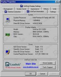 Теперь рассмотрим процесс инсталляции видеокарты Leadtek WinFast 3D S320V. Драйвера, поставляемые с ней, установились без осложнений. В настройках дисплея появился ряд новых закладок, в том числе с информацией о данной плате: