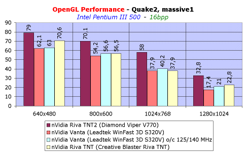 Мы решили свое рассмотрение Vanta построить на сравнении Leadtek WinFast 3D S320V с видеокартой на базе nVidia Riva TNT (Creative 3D Blaster Riva TNT). Для оценки положения Vanta относительно Riva TNT2 (поскольку, оба чипсета вышли почти одновременно) мы приведем также данные по Diamond Viper V770 (на базе TNT2).