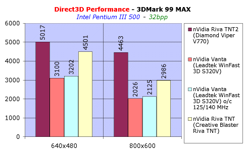 Теперь рассмотрим производительность Vanta в 3D. В рекламе нам обещают, что ядро у Vanta то же, что и у TNT2, за исключением работы с памятью (64 битная шина, вместо 128-битной у TNT2 и TNT). Посмотрим, как сказалось это ограничение на производительности.