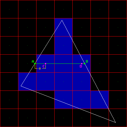 Небольшой полигон всего в несколько квадратных пикселей изображен с равномерным заполнением только для простоты. Мы хотим просчитать линию А-В. Но мы имеем дело с пикселизованным экраном, поэтому мы сможем вывести на экран только линию, состоящую из трех пикселей С- D. Центр первого пикселя, С, не совпадает с центром точки А, а центр пикселя D не совпадает с точкой B.