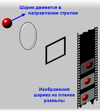 Затвор открывается, и пленка начинает регистрировать свет от движущегося шарика. Процесс очень напоминает предыдущий, но теперь изображение шарика на пленке будет терять четкость и выглядеть размытым. Это размытость движения, или motion blur.