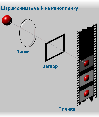 На рисунке справа мы видим схематический рисунок процесса снятия на кинопленку неподвижного красного шарика. Кинокамера изображена в виде её основных частей: линз, затвора и самой пленки.