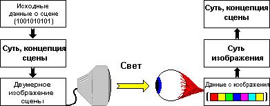 Создавая изображение любого вида, вы пытаетесь сформировать световой образ на сетчатке глаза таким образом, чтобы он интерпретировался мозгом как предмет, который отображает это изображение. Тренированный мозг может извлечь огромное количество информации из изображения. Благодаря этому в голове мы можем получить полное трехмерное представление сцены, изображенной на двухмерной картинке. Чтобы получить это, наш мозг анализирует порядок взаимодействия света со сценой (набором объектов изображенных на картинке) и на основе такого анализа данных выдает нам конечное трехмерное представление сцены.