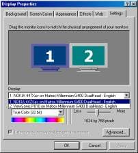 Второй вариант, наиболее интересный — это возможность подключения второго монитора. При этом мы можем как использовать второй монитора в качестве дублера первого (то есть на втором полностью повторяется изображение с первого), так и для расширения рабочего стола. Эту возможность мы рассмотрим поподробнее. В данном случае мы можем выбрать один из двух мониторов и конкретно для него осуществить настройки по разрешению, частоте регенерации и др. Все это возможно благодаря тому, что Matrox Millennium G400 имеет два раздельных модуля CRTC (Cathode Ray Tube Controller), которые позволяют использование двух мониторов независимо друг от друга. Таким образом, к Matrox Millennium G400 можно подключать совершенно разные по своим характеристикам мониторы (кроме LCD, для них требуется отдельный модуль). После настройки обоих мониторов (я сделал на обоих одинаковое разрешение 1024х768) мы можем видеть необычного размера рабочий стол: