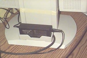 Итак, к монитору прилагается блок питания, который, хоть и имеет небольшие размеры, но на столе мешать все же может. Идея инженеров компании проста до гениальности — надо его куда-нибудь сложить. Так на свет появилась подставка (см. фото), которая своими ножками вставляется в отверстия на задней части подставки монитора. Не эстетично, конечно, но, по крайней мере, на столе или под столом блок питания не валяется.