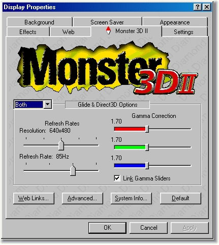 Теперь о драйверах. Ставить просто, есть драйвера под WinNT. После инсталяции, в "Display Properties" добавляется вкладка "Monster 3D II". Можно настроить рефреши и гамму*, как для раздельно для Direct3D и Glide, так и для обеих API сразу (Both).