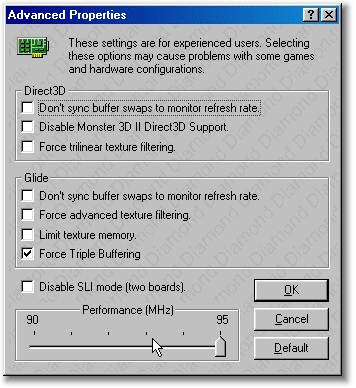 В "Advanced Properties" есть регулируемая шкала "Perfomance (MHz)", позволяющая разгонять карту "в пределах разумного" :) Думаю все поставят 95 MHz (92 по умолчанию).