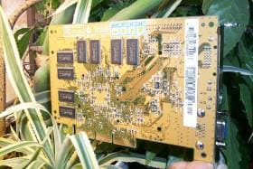 Дальнейший осмотр PCB показал, что видеокарта в остальном, кроме вентилятора, от reference card ничем не отличается. PCB имеет темно-желтый цвет, протестированный нами экземпляр имел смонтированный TV-out и пустые места под монтаж вывода на цифровой LCD-монитор. TV-out управляется микросхемой от Conexant (бывшая BrookTree) BT869.