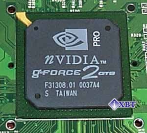 На карте установлен графический процессор GeForce2 Pro, который можно увидеть после снятия кулера. Последний закреплен на клипсах, поэтому его легко можно снять и/или заменить.