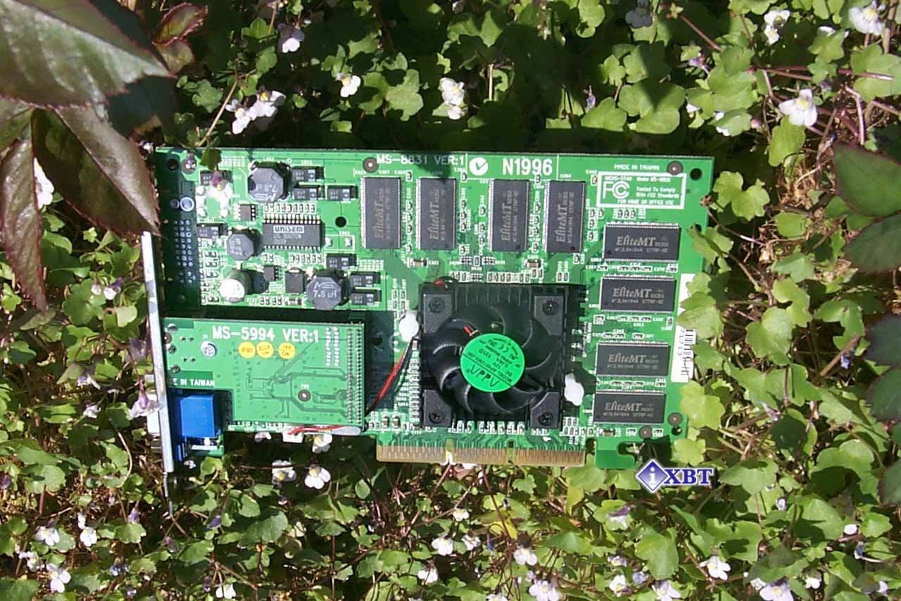 Микросхемы памяти EliteMT, время выборки 5ns, что соответствует частоте в 200 (400) МГц. На этой частоте память и работает. Да, это рядовая карта на базе GeForce2 Pro, поэтому даже увидительно было ожидать каких-либо сюрпризов от нее. В лице этой платы мы видим просто копию reference card.