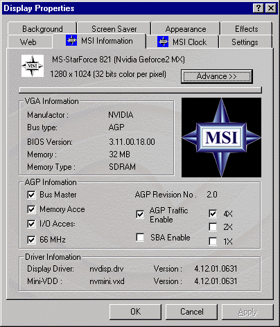 - Соответствие характеристик MSI MX400 Pro-VT32S (MS 8833) платам на базе GeForce2 MX400, при этом получаем производительность выше из-за более быстрой памяти, плюс наличие у карты VIVO, а также поддержку технологии SafeBIOS;
