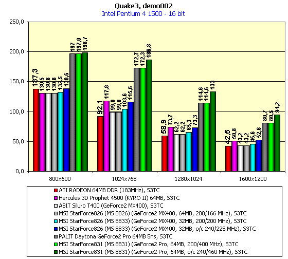 - MSI MX400 Pro64S (MS 8826) показала производительность на уровне рядовых GeForce2 MX, поскольку частота работы памяти в 166 МГц не позволила этой карте в 32-битном цвете продемонстрировать производительность GeForce2 MX400 (даром, что установлено 64 мегабайта памяти).