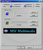 Несмотря на отсутствие радиаторов на памяти, при наличии дополнительного охлаждения MSI StarForce822 (MS 8822) продемонстрировала рекордный уровень по разгону частот — 250/275 (550) МГц! Видимо, отличная теплопередача между чипом и кулером, а также потенциал конкретного GPU дали возможность без применения экстремальных средств охлаждения получить частоту работы процессора в 250 МГц. А предел по частоте работы памяти просто потрясает, ведь, как я уже выше сказал, никаких средств по охлаждению памяти нет.