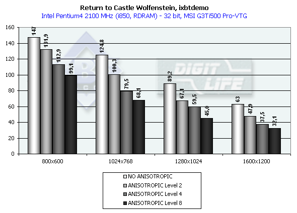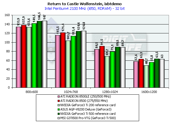- Return to Castle Wolfenstein (id Software) игровой тест, демонстрирующий работу платы в OpenGL с использованием нами созданного и записанного демо-бенчмарка ixbtdemo.