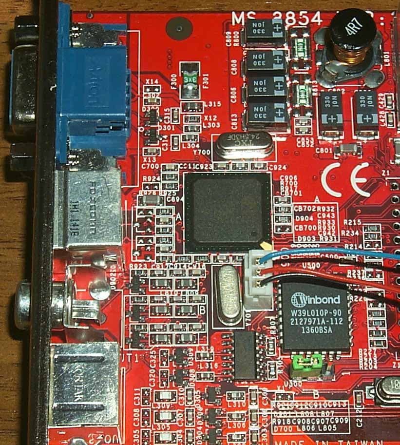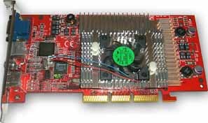 Рассматривая карту дальше, мы замечаем наличие у вентилятора трех проводов, что свидетельствует о том, что есть тахометр. Кстати, на чипе установлен огромный и явно очень похожий на "Leadtek-овский" радиатор.