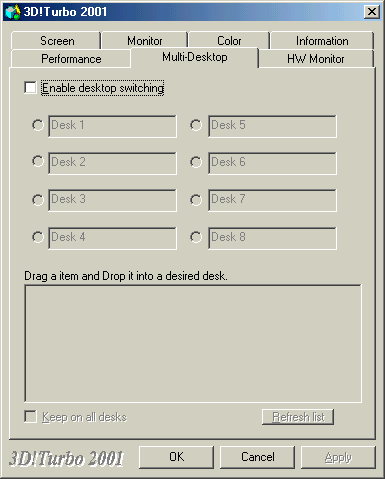 Как видим, эта программа содержит довольно много возможностей для тонкой настройки работы карты, в том числе и разгона. Можно отметить наличие системы виртуальных десктопов и возможность выставления частоты смены кадров одновременно со сменой разрешения. Однако изюминка находится на следующей закладке: