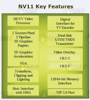 SDR-память будет работать на штатной частоте от 183 МГц до 200 МГц, в зависимости от типа чипов. При этом, в случае с NV11 допускается использование как 128-разрядного интерфейса памяти, так и 64-битного, что позволит производителям видеоадаптеров использовать более дешевую память. Очевидно, что в виду указанных выше внутренних ограничений NV11 не имеет смысла использовать с ней DDR-память, в полную 128 бит ширину внешнего интерфейса. Мобильный вариант NV11 будет иметь урезанный вдвое интерфейс памяти, т.е. будет поддерживаться 64-разрядный и 32-разрядный интерфейс памяти. Пусть вас не смущает такое урезание интерфейса памяти, оно вполне оправдано как с инженерной точки зрения, так и с функциональной. Мобильный вариант NV11 будет комплектоваться 8 Мб или 16 Мб локальной видеопамяти, а больше в ноутбуках и не нужно.