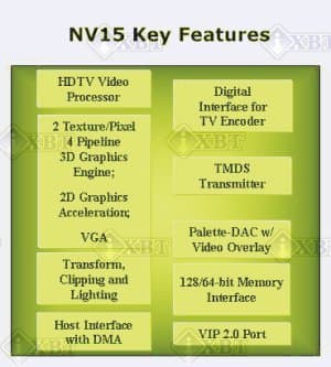 NV15 и NV11 имеют встроенный HDTV-процессор, что дает возможность смотреть соответствующим образом закодированные ТВ-программы на мониторе. Оба чипа поддерживают интерфейс PCI 2.2 и AGP x4 (включая режим Fast Writes)