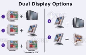 Заметим, что дополнительный RAMDAC требуется только в том случае, если нужно вывести два независимых изображения на два CRT-монитора. Для того, чтобы использовать второй CRT-монитор в качестве дублера первого (то есть, на втором мониторе полностью повторяется изображение с первого) или использования второго монитора для расширения рабочего стола, установка дополнительного RAMDAC на плату не требуется, аналогично тому, как это реализовано в G400.