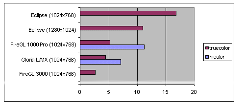 По просьбам общественности мы протестировали платы FireGL 3000, GLoria-L/MX и Eclipse II на предмет их использования в качестве платформы для Quake 2. Все они имеют очень низкую скорость даже на низких разрешениях. Дело в том, что играм требуется от 3D-ускорителя высокая скорость обработки треугольников и текстурирования. Профессиональные платы дают сравнительно низкий throuhput и fillrate, поэтому и показывают низкую скорость в Quake 2. От профессиональной платы требуется высокое качество на высоких разрешениях и стабильная работа с оптимизацией под конкретные приложения. Как мы уже говорили 1024x768 в truecolor, наложение truecolor текстур 1024x1024 и текстурная память 16 MB и выше — обязательные требования, которые совершенно не нужны в играх.
