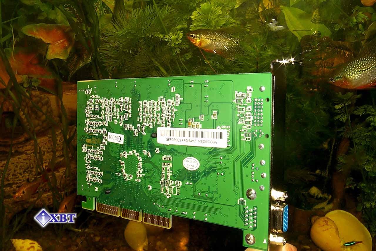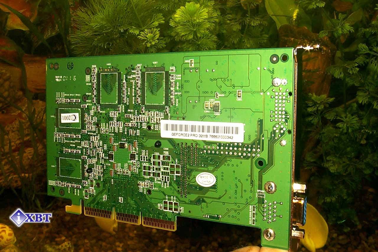 Посмотрите на снимки выше. Для сравнения PALIT Daytona GeForce2 Pro 64MB 5 ns была сфотографирована рядом с SUMA Platinum GeForce2 Pro, которая изготовлена на основе эталонного дизайна. Прежде всего в глаза бросаются размеры PCB, которые у исследуемой ныне карты значительно меньше за счет более близкого расположения к чипсету микросхем памяти. Также нет места под распайку контактов для посадки дочерней карты с TV-out, а как мы помним, именно эта особенность расположения TV-out на дочерней плате, а не на самой PCB, в свое время была одним из ключевых отличий дизайна GeForce2 GTS/Pro — карт от более ранних поколений. Непосредственно сам TV-out не распаян ни на одной из рассматриваемых в этой статье карт, хотя разводка под него у 64-мегабайтной платы имеется.
