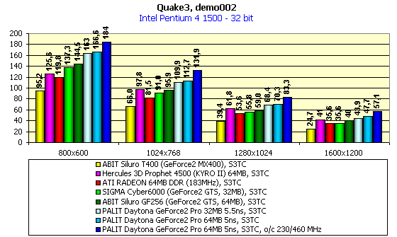 - Соответствие скоростных и качественных параметров PALIT Daytona GeForce2 Pro уровню, который мы наблюдаем у линейки GeForce2 Pro — карт;