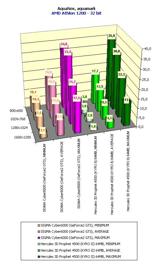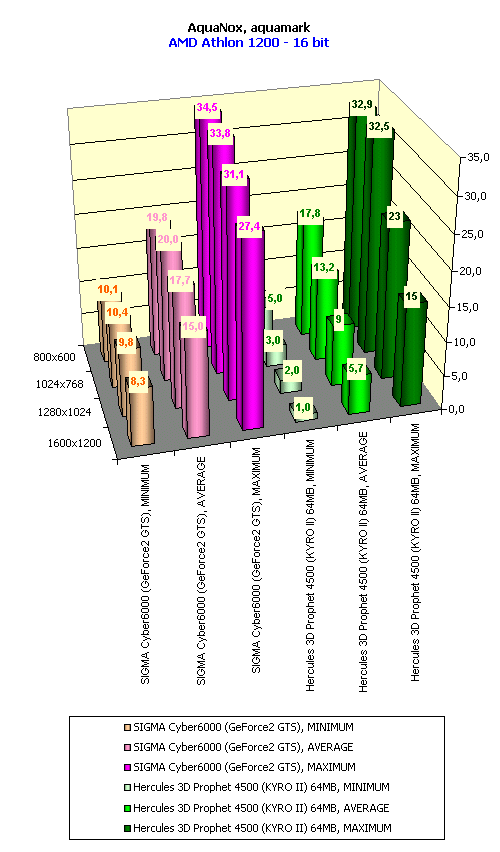 В этом тесте кроме супер-сложных сцен присутствует и относительно большое число перекрытий объектов (overdraw), поэтому в AquaMark уже GeForce2 GTS резко сдал и отставание KYRO II от него не столь фатально, как в Giants. Однако, с ростом разрешения, филлрейта KYRO II становится явно мало, и разница уже получается в разы. Видно, что играбельность у обеих карт явно ниже предельно допустимого минимума.