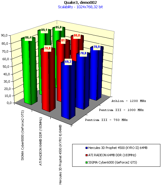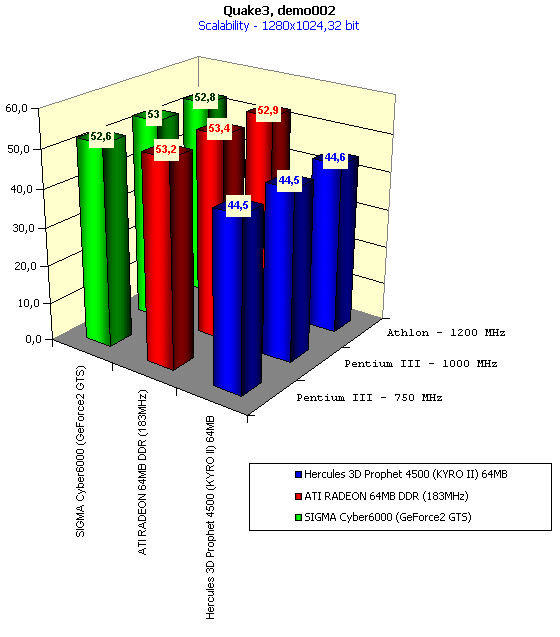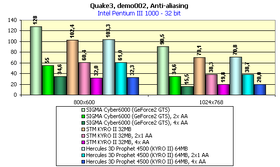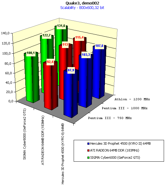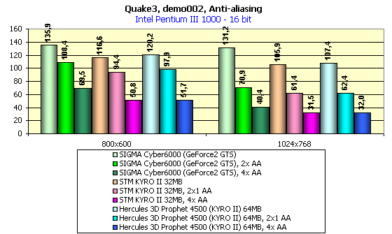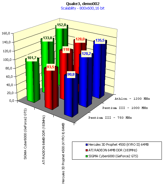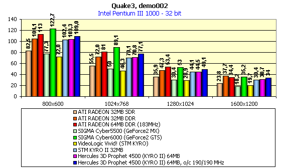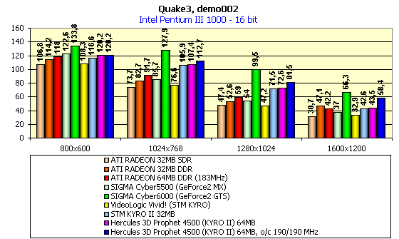 Для сравнительного анализа были использованы показания с видеокарт SIGMA Сyber5500 (GeForce2 MX), SIGMA Cyber6000 (GeForce2 GTS), ATI RADEON 32MB SDR, ATI RADEON 32MB DDR, ATI RADEON 64MB DDR (183MHz), ABIT Siluro GF256 (GeForce2 GTS 64MB), reference card STM KYRO II 32MB.