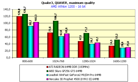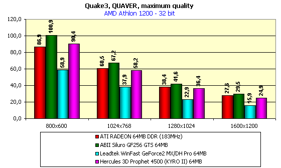 В 16-битном цвете мы видим практическое равенство между KYRO II и RADEON DDR при сильном отставании от GeForce2 GTS. А вот в 32-битном цвете урезание производительности у GeForce2 GTS за счет низкой пропускной способности видеопамяти сильно сказывается, и первое место, занятое этой картой, уже не столь значительно выделяется. А равенство между KYRO II и RADEON DDR и тут имеет место. Очень хорошо заметно, что именно в 32-битном цвете Hercules 3D Prophet 4500 по производительности находится ближе к GeForce2 GTS, чем к GeForce2 MX. Однако если сравнить стоимости 64-х мегабайтного RADEON в Retail-поставке (только у таковых частота работы — 183 МГц), 64-х мегабайтной карты на GeForce2 GTS с ценой на Hercules 3D Prophet 4500, то вывод очевиден.
