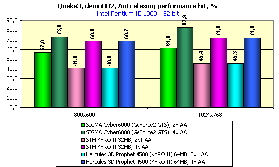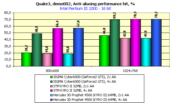 Вышеприведенные диаграммы демонстрируют падение производительности при активизации АА в процентном соотношении. Как можем видеть, в 32-битном цвете падение производительности у GeForce2 GTS больше, так как изначально скорость работы этой карты без АА была выше.
