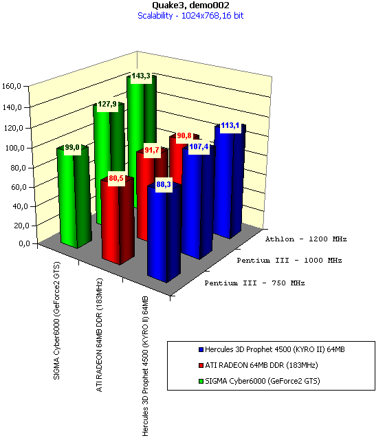 - — 1280x1024 — это разрешение венчает возможности всех карт по масштабируемости. Уже все три представленные карты не имеют прироста производительности при увеличении частот работы CPU. В 16-битном цвете KYRO II по-прежнему опережает ATI RADEON DDR.