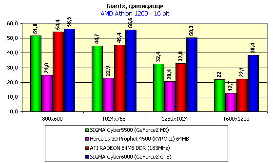 До сего момента картина относительно судьбы и будущего KYRO II выглядела весьма радужно, однако мы запустили тяжелое приложение, имеющее очень сложные сцены, а также использующее Hardware TCL. И что мы видим? Сокрушительное поражение KYRO II. Даже карта на GeForce2 MX легко обошла Hercules 3D Prophet 4500. А ведь Giants — это не технодемка, не синтетический тест, а реальная игра, которая вовсю продается. Конечно, тестирование проводилось при максимальном качестве и при включенных эффектах рельефного текстурирования (Dot3 и EMBM), а также кубического текстурирования. Поэтому этот тест для всех карт был весьма сложным, однако столь сильное падение KYRO II не может не вызывать разочарования.