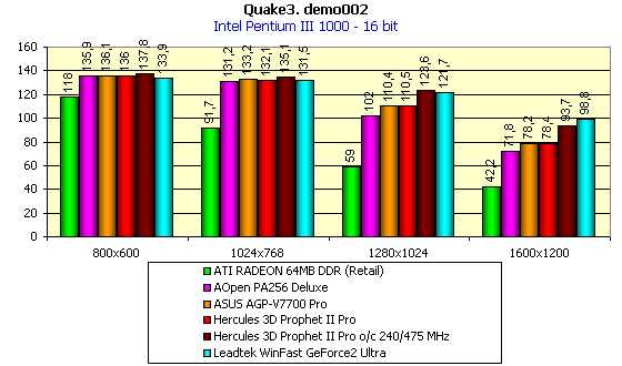 Для сравнительного анализа были использованы показания с видеокарт ATI RADEON 64MB (Retail-поставка, частоты 183/183 МГц), AOpen PA256 Deluxe, Leadtek WinFast GeForce2 Pro и ASUS AGP-V7700 Pro.