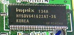 Микросхемы памяти произведены компанией Hynix (бывшая Hyundai Semiconductor) и имеют время выборки 3.6 ns, т.е. чипы памяти рассчитаны на рабочую частоту 277 (554) МГц.