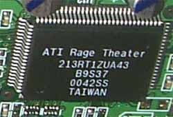 Как я уже говорил ранее, RADEON 8500 комплектуется сопроцессором RAGE THEATER, отвечающим за мультимедийные функции. В данном случае у этого чипсета необычная роль. Прежде всего, как можно догадаться по наличию DVI, да и по схожести PCB с PCB RADEON 7500, исследуемая карта полноценно поддерживает мультимониторность, то есть предоставляет все возможности, имеющиеся у 7500-го, в том числе и TV-out, полноценно работающий отдельно от монитора. Однако если младшая карта реализует эту функцию с помощью самого графического процессора, то у RADEON 8500 за ТВ-выход отвечает RAGE THEATER.