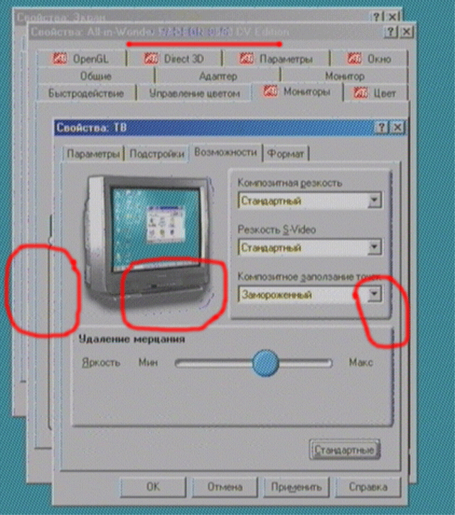 С освоением особенностей и возможностей TV-out возникло больше всего затруднений. Присутствие устройств, подключенных к своим аналоговым видеовыходам, плата определяет по их внутреннему входному сопротивлению. А я долго и упорно пытался подключить студийный монитор Sony PVM-14M2E, имеющий только входы с высоким входным сопротивлением и сквозным проходом. Но все же когда удалось выход включить, то его качество приятно удивило. Пиксельные биения и мерцание на контрастных переходах отсутствовали полностью. Не пришлось даже применять дополнительные регулировки, которые имеются в соответствующих закладках в большом количестве. Но вскоре обнаружился один серьезный дефект: на нейтральном сером фоне иногда вылезают яркие цветные шумы. Наглядный пример представлен на приведенном справа фрагменте. Наиболее часто это проявляется и досаждает при просмотре телевизионных программ.