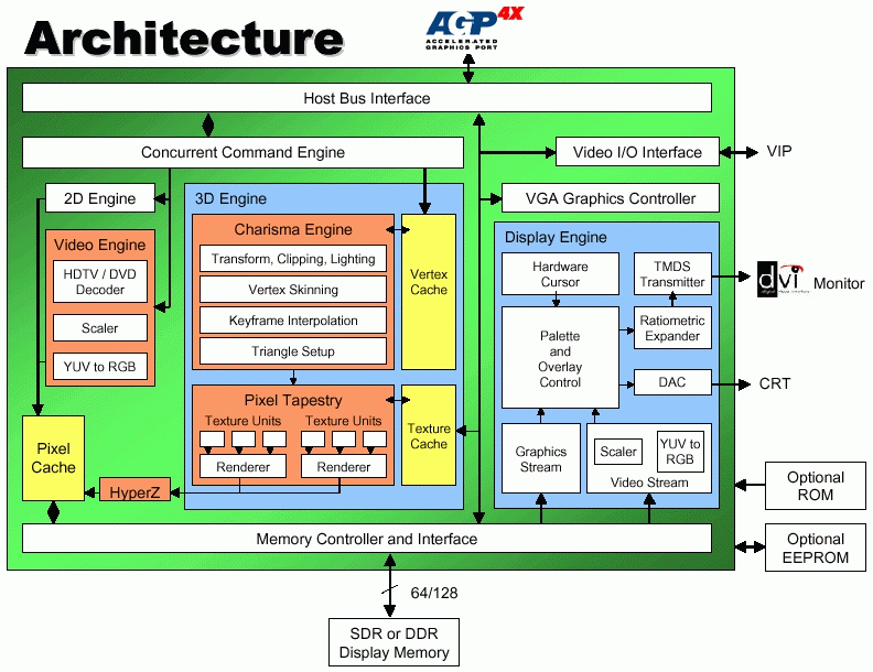 Теперь поговорим более подробно о некоторых деталях нового чипа и новых решениях от ATI. Для начала посмотрим на схематичное представление архитектуры RADEON 256:
