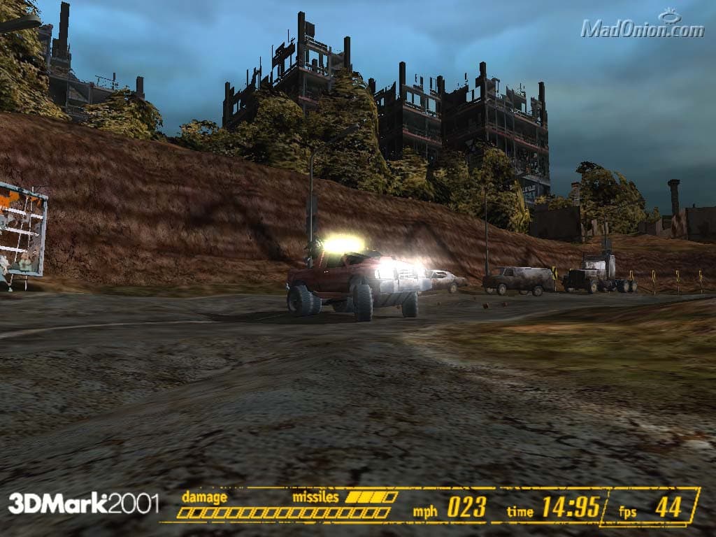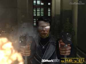 Нареканий вроде нет (если не считать немного не понравившейся мне дымки при выстрелах). Интересно отметить, что очень близкой к этой сцене является игра Max Payne, базирующаяся на том же движке, что и 3DMark2001. Посмотрим, а что в ней показывает RADEON 7500. В целом, все нормально, но вот с туманом проблемы: он полосками и какой-то радужно-неестественный.