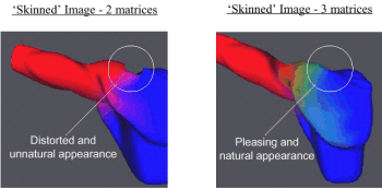 Vertex Skinning. Это метод натяжения текстур на полигоны при использовании скелетной анимации. На самом деле, под этим термином скрывается процесс интерполяции вершин полигонов (vertex blending). Применяется Vertex Skinning для того, чтобы на стыках текстур были плавные, естественные переходы, особенно во время движения. Интерполяция вершин осуществляется с помощью матриц, называемых Skinning Matrices for Vertex Blending.