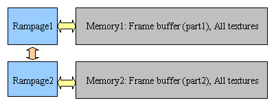Применение чипов растеризаторов с собственными шинами памяти увеличит ее эффективную пропускную способность. Но у любого плюса, разумеется, есть и свои минусы. В первую очередь мы сталкиваемся с высокой ценой многочипового ускорителя. Во вторую, мы вынуждены дублировать текстуры в локальной памяти чипа. Это уже хорошо известные аспекты. А вот и новый — нам не ясно где мы будем хранить геометрию. Делать еще один локальный геометрический буфер для Sage слишком расточительно. Значит надо: