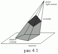 При освещении сцены в тени оказываются те объекты, которые попадают внутрь т.н. теневого объёма. Теневой объём — это представление пространства за объектом, из которого не наблюдается источник света, в виде полигонального объекта (см. рис. 4.1). Впервые этот алгоритм был описан в [Crow77].