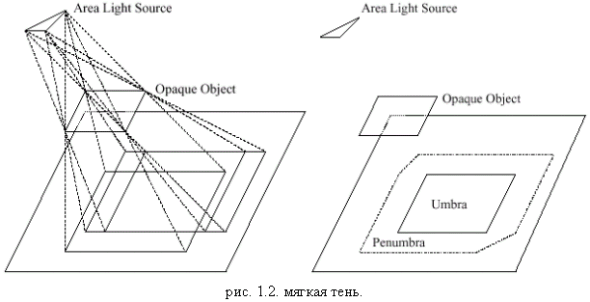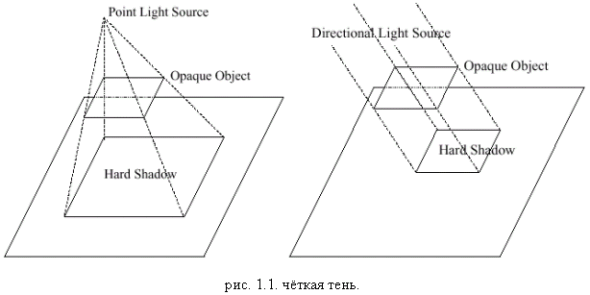 Тени бывают чёткие (hard shadows) и мягкие (soft shadows). Чёткие тени получаются, когда имеется точечный источник или источник направленного параллельного света. В этом случае, согласно геометрической оптике Френеля, тень получается, как показано на рис.1.1: