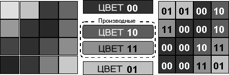 Ниже приведена иллюстрация блока текселей в первичном виде, 2-х битная индексная матрица, с помощью которой определяется вид блока текселей после сжатия. Нетрудно заметить, что каждый тексель в блоке после сжатия определяется одним из четырех цветов таблицы выборки, наложенным на значение текселя в исходном блоке.