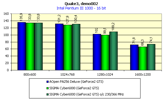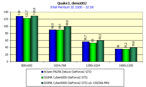 Карта SIGMA Cyber6000 показала очень скромный потенциал по разгону, прежде всего по памяти. Удалось добиться устойчивой работы на частотах 230/183 (366) МГц. Выше поднимать частоту работы памяти оказалось уже бесполезно, на 190 МГц периодически уже возникали артефакты. По сравнению с ранее рассмотренными платами такого же класса данные разгона Cyber6000 являются практически самыми малозначимыми. Хорошо известно, что видеокарты класса GeForce2 GTS "страдают" недостаточной пропускной способностью памяти, и поэтому разгон по памяти является для них намного более важным, чем разгон GPU.