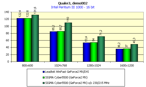 Обе карты SIGMA Cyber5500 и 5500DVI показали почти одинаковый и неплохой потенциал по разгону. Удалось добиться устойчивой работы на частотах 230/215 МГц. С учетом того, что установлена 6 ns память, это очень хорошие показатели по разгону памяти (обычно выше 210 МГц не получается). Хорошо известно, что видеокарты класса GeForce2 MX уже не просто, а очень "страдают" от недостаточной пропускной способностью памяти, и поэтому разгон по памяти является для них намного более важным, чем разгон GPU.