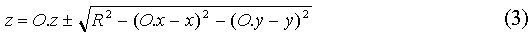 Получив координаты (x, y) пикселя, нужно найти z координату точки X на сфере, проецирующейся в этот пиксель. Это можно сделать пользуясь следующей формулой: