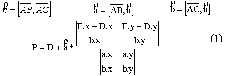 Для этого, рассмотрим плоскость, в которой лежат все три вершины A, B, C треугольника. Пересечение сферы и плоскости дает окружность, которая является описанной вокруг треугольника окружностью. Ее центр P лежит в точке пересечения срединных перпендикуляров и может быть найден по следующей формуле: