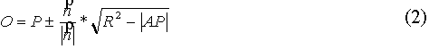 Вектор с началом в центре сферы O и концом в центре окружности P коллинеарен вектору нормали n. Таким образом, мы получаем прямоугольный треугольник APO, гипотенуза и один катет которого известны. Это позволяет найти точку O по следующей формуле: