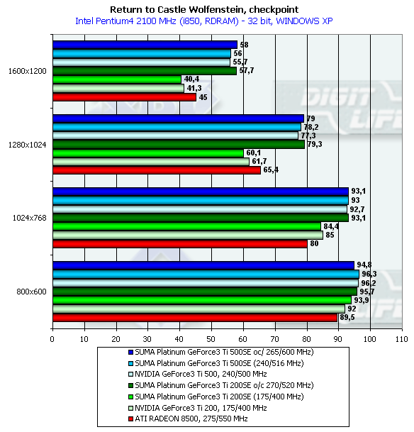 - Return to Castle Wolfenstein (id Software) игровой тест, демонстрирующий работу платы в OpenGL с использованием демо-бенчмарка Checkpoint.