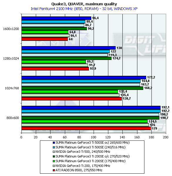 SUMA Platinum GeForce3 Ti 200SE (DVI) продемонстрировала абсолютно рекордный уровень по повышению частот 270/260 (520) МГц.